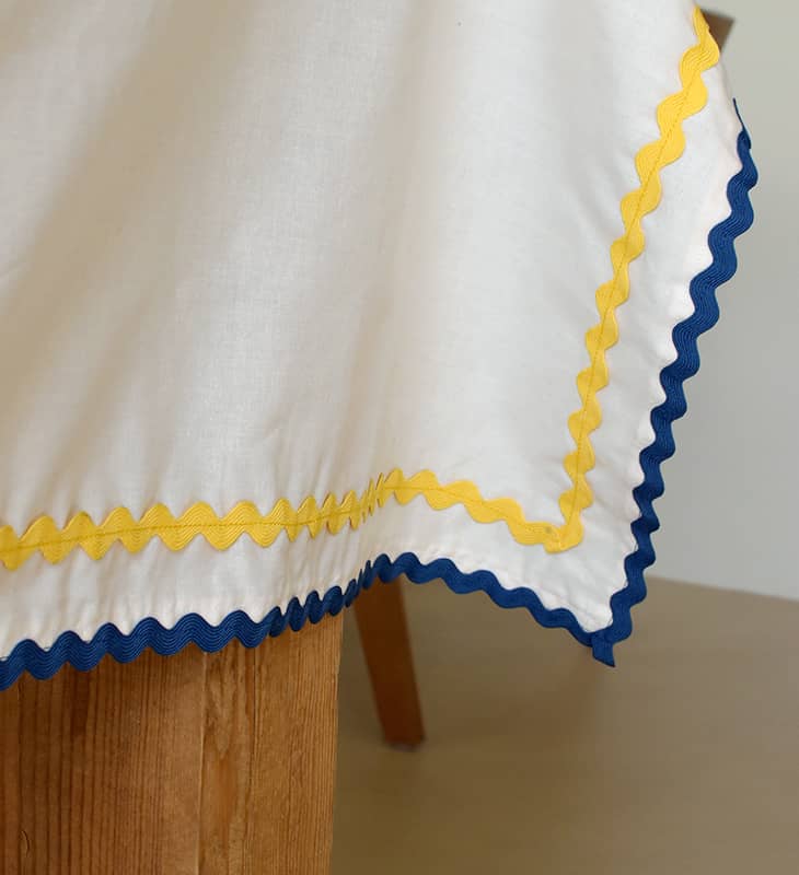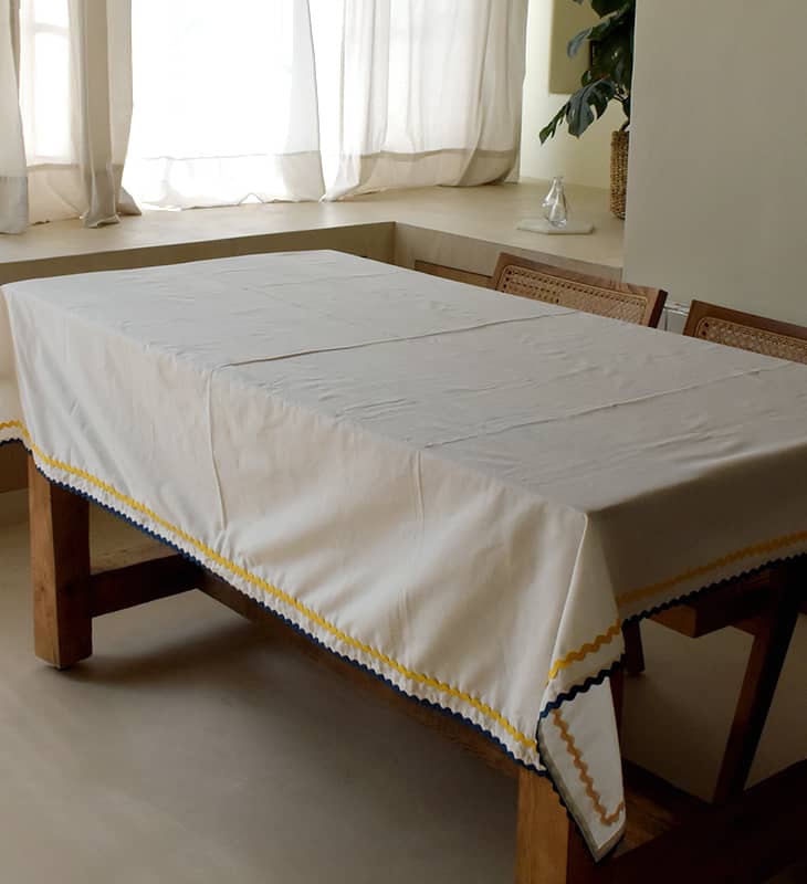 Mantel blanco roto de algodón 100% de alta calidad con detalles coloridos en azul marino y amarillo.