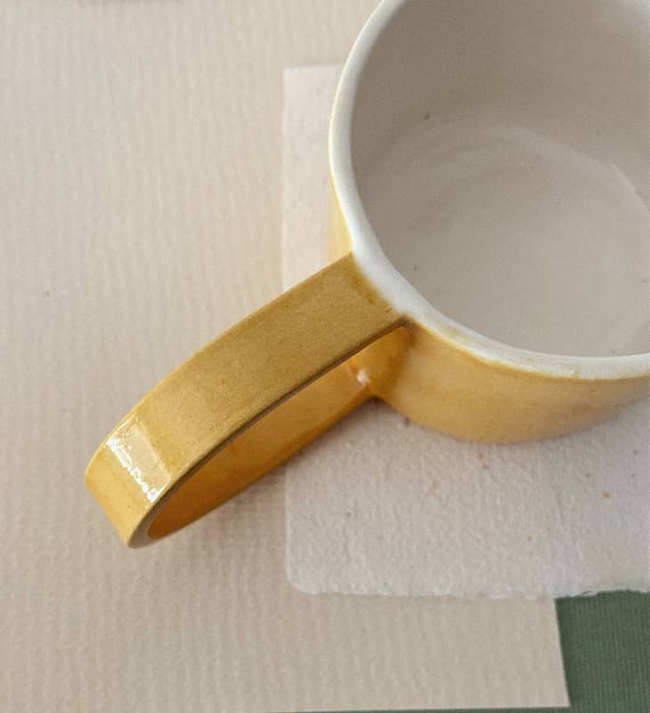Taza de asa grande hecha a mano con técnica plancha y pellizco.